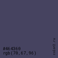 Цвет #464360 в цветовой модели RGB обозначается тремя октетами (70, 67, 96) в десятичном формате и #464360 в шестнадцатиричном (hex) формате, которые являются интенсивностью красного 70 (hex 46), интенсивность зелёного 67 (hex 43) и интенсивность синего 96 (hex 60).