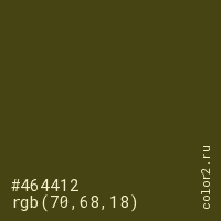 Цвет #464412 в цветовой модели RGB обозначается тремя октетами (70, 68, 18) в десятичном формате и #464412 в шестнадцатиричном (hex) формате, которые являются интенсивностью красного 70 (hex 46), интенсивность зелёного 68 (hex 44) и интенсивность синего 18 (hex 12).