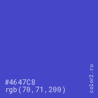 Цвет #4647C8 в цветовой модели RGB обозначается тремя октетами (70, 71, 200) в десятичном формате и #4647C8 в шестнадцатиричном (hex) формате, которые являются интенсивностью красного 70 (hex 46), интенсивность зелёного 71 (hex 47) и интенсивность синего 200 (hex C8).