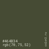 Цвет #464B34 в цветовой модели RGB обозначается тремя октетами (70, 75, 52) в десятичном формате и #464B34 в шестнадцатиричном (hex) формате, которые являются интенсивностью красного 70 (hex 46), интенсивность зелёного 75 (hex 4B) и интенсивность синего 52 (hex 34).