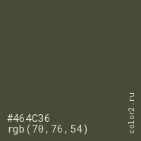 Цвет #464C36 в цветовой модели RGB обозначается тремя октетами (70, 76, 54) в десятичном формате и #464C36 в шестнадцатиричном (hex) формате, которые являются интенсивностью красного 70 (hex 46), интенсивность зелёного 76 (hex 4C) и интенсивность синего 54 (hex 36).