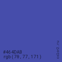 Цвет #464DAB в цветовой модели RGB обозначается тремя октетами (70, 77, 171) в десятичном формате и #464DAB в шестнадцатиричном (hex) формате, которые являются интенсивностью красного 70 (hex 46), интенсивность зелёного 77 (hex 4D) и интенсивность синего 171 (hex AB).