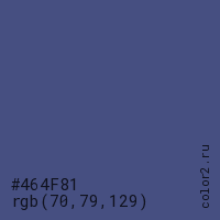 Цвет #464F81 в цветовой модели RGB обозначается тремя октетами (70, 79, 129) в десятичном формате и #464F81 в шестнадцатиричном (hex) формате, которые являются интенсивностью красного 70 (hex 46), интенсивность зелёного 79 (hex 4F) и интенсивность синего 129 (hex 81).