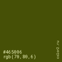 Цвет #465006 в цветовой модели RGB обозначается тремя октетами (70, 80, 6) в десятичном формате и #465006 в шестнадцатиричном (hex) формате, которые являются интенсивностью красного 70 (hex 46), интенсивность зелёного 80 (hex 50) и интенсивность синего 6 (hex 06).