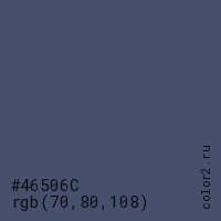Цвет #46506C в цветовой модели RGB обозначается тремя октетами (70, 80, 108) в десятичном формате и #46506C в шестнадцатиричном (hex) формате, которые являются интенсивностью красного 70 (hex 46), интенсивность зелёного 80 (hex 50) и интенсивность синего 108 (hex 6C).