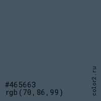 Цвет #465663 в цветовой модели RGB обозначается тремя октетами (70, 86, 99) в десятичном формате и #465663 в шестнадцатиричном (hex) формате, которые являются интенсивностью красного 70 (hex 46), интенсивность зелёного 86 (hex 56) и интенсивность синего 99 (hex 63).