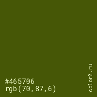 Цвет #465706 в цветовой модели RGB обозначается тремя октетами (70, 87, 6) в десятичном формате и #465706 в шестнадцатиричном (hex) формате, которые являются интенсивностью красного 70 (hex 46), интенсивность зелёного 87 (hex 57) и интенсивность синего 6 (hex 06).