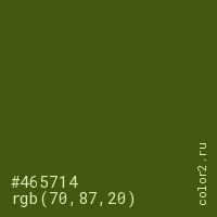 Цвет #465714 в цветовой модели RGB обозначается тремя октетами (70, 87, 20) в десятичном формате и #465714 в шестнадцатиричном (hex) формате, которые являются интенсивностью красного 70 (hex 46), интенсивность зелёного 87 (hex 57) и интенсивность синего 20 (hex 14).