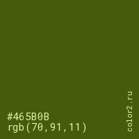Цвет #465B0B в цветовой модели RGB обозначается тремя октетами (70, 91, 11) в десятичном формате и #465B0B в шестнадцатиричном (hex) формате, которые являются интенсивностью красного 70 (hex 46), интенсивность зелёного 91 (hex 5B) и интенсивность синего 11 (hex 0B).