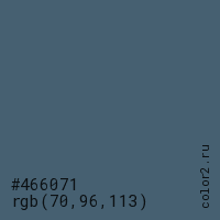Цвет #466071 в цветовой модели RGB обозначается тремя октетами (70, 96, 113) в десятичном формате и #466071 в шестнадцатиричном (hex) формате, которые являются интенсивностью красного 70 (hex 46), интенсивность зелёного 96 (hex 60) и интенсивность синего 113 (hex 71).