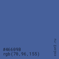 Цвет #46609B в цветовой модели RGB обозначается тремя октетами (70, 96, 155) в десятичном формате и #46609B в шестнадцатиричном (hex) формате, которые являются интенсивностью красного 70 (hex 46), интенсивность зелёного 96 (hex 60) и интенсивность синего 155 (hex 9B).
