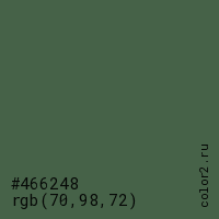 Цвет #466248 в цветовой модели RGB обозначается тремя октетами (70, 98, 72) в десятичном формате и #466248 в шестнадцатиричном (hex) формате, которые являются интенсивностью красного 70 (hex 46), интенсивность зелёного 98 (hex 62) и интенсивность синего 72 (hex 48).