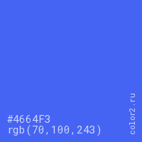 Цвет #4664F3 в цветовой модели RGB обозначается тремя октетами (70, 100, 243) в десятичном формате и #4664F3 в шестнадцатиричном (hex) формате, которые являются интенсивностью красного 70 (hex 46), интенсивность зелёного 100 (hex 64) и интенсивность синего 243 (hex F3).