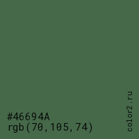 Цвет #46694A в цветовой модели RGB обозначается тремя октетами (70, 105, 74) в десятичном формате и #46694A в шестнадцатиричном (hex) формате, которые являются интенсивностью красного 70 (hex 46), интенсивность зелёного 105 (hex 69) и интенсивность синего 74 (hex 4A).