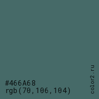 Цвет #466A68 в цветовой модели RGB обозначается тремя октетами (70, 106, 104) в десятичном формате и #466A68 в шестнадцатиричном (hex) формате, которые являются интенсивностью красного 70 (hex 46), интенсивность зелёного 106 (hex 6A) и интенсивность синего 104 (hex 68).
