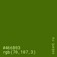 Цвет #466B03 в цветовой модели RGB обозначается тремя октетами (70, 107, 3) в десятичном формате и #466B03 в шестнадцатиричном (hex) формате, которые являются интенсивностью красного 70 (hex 46), интенсивность зелёного 107 (hex 6B) и интенсивность синего 3 (hex 03).