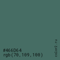 Цвет #466D64 в цветовой модели RGB обозначается тремя октетами (70, 109, 100) в десятичном формате и #466D64 в шестнадцатиричном (hex) формате, которые являются интенсивностью красного 70 (hex 46), интенсивность зелёного 109 (hex 6D) и интенсивность синего 100 (hex 64).