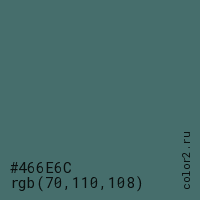 Цвет #466E6C в цветовой модели RGB обозначается тремя октетами (70, 110, 108) в десятичном формате и #466E6C в шестнадцатиричном (hex) формате, которые являются интенсивностью красного 70 (hex 46), интенсивность зелёного 110 (hex 6E) и интенсивность синего 108 (hex 6C).