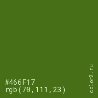 Цвет #466F17 в цветовой модели RGB обозначается тремя октетами (70, 111, 23) в десятичном формате и #466F17 в шестнадцатиричном (hex) формате, которые являются интенсивностью красного 70 (hex 46), интенсивность зелёного 111 (hex 6F) и интенсивность синего 23 (hex 17).