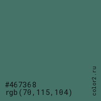 Цвет #467368 в цветовой модели RGB обозначается тремя октетами (70, 115, 104) в десятичном формате и #467368 в шестнадцатиричном (hex) формате, которые являются интенсивностью красного 70 (hex 46), интенсивность зелёного 115 (hex 73) и интенсивность синего 104 (hex 68).