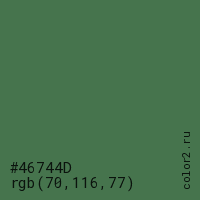 Цвет #46744D в цветовой модели RGB обозначается тремя октетами (70, 116, 77) в десятичном формате и #46744D в шестнадцатиричном (hex) формате, которые являются интенсивностью красного 70 (hex 46), интенсивность зелёного 116 (hex 74) и интенсивность синего 77 (hex 4D).