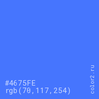 Цвет #4675FE в цветовой модели RGB обозначается тремя октетами (70, 117, 254) в десятичном формате и #4675FE в шестнадцатиричном (hex) формате, которые являются интенсивностью красного 70 (hex 46), интенсивность зелёного 117 (hex 75) и интенсивность синего 254 (hex FE).