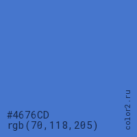 Цвет #4676CD в цветовой модели RGB обозначается тремя октетами (70, 118, 205) в десятичном формате и #4676CD в шестнадцатиричном (hex) формате, которые являются интенсивностью красного 70 (hex 46), интенсивность зелёного 118 (hex 76) и интенсивность синего 205 (hex CD).