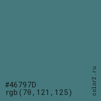 Цвет #46797D в цветовой модели RGB обозначается тремя октетами (70, 121, 125) в десятичном формате и #46797D в шестнадцатиричном (hex) формате, которые являются интенсивностью красного 70 (hex 46), интенсивность зелёного 121 (hex 79) и интенсивность синего 125 (hex 7D).