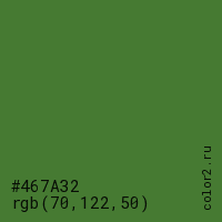 Цвет #467A32 в цветовой модели RGB обозначается тремя октетами (70, 122, 50) в десятичном формате и #467A32 в шестнадцатиричном (hex) формате, которые являются интенсивностью красного 70 (hex 46), интенсивность зелёного 122 (hex 7A) и интенсивность синего 50 (hex 32).