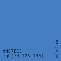 Цвет #467EC3 в цветовой модели RGB обозначается тремя октетами (70, 126, 195) в десятичном формате и #467EC3 в шестнадцатиричном (hex) формате, которые являются интенсивностью красного 70 (hex 46), интенсивность зелёного 126 (hex 7E) и интенсивность синего 195 (hex C3).