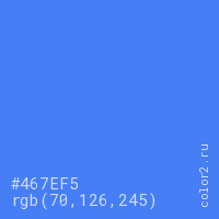 Цвет #467EF5 в цветовой модели RGB обозначается тремя октетами (70, 126, 245) в десятичном формате и #467EF5 в шестнадцатиричном (hex) формате, которые являются интенсивностью красного 70 (hex 46), интенсивность зелёного 126 (hex 7E) и интенсивность синего 245 (hex F5).