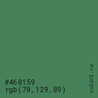 Цвет #468159 в цветовой модели RGB обозначается тремя октетами (70, 129, 89) в десятичном формате и #468159 в шестнадцатиричном (hex) формате, которые являются интенсивностью красного 70 (hex 46), интенсивность зелёного 129 (hex 81) и интенсивность синего 89 (hex 59).