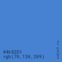 Цвет #4682D1 в цветовой модели RGB обозначается тремя октетами (70, 130, 209) в десятичном формате и #4682D1 в шестнадцатиричном (hex) формате, которые являются интенсивностью красного 70 (hex 46), интенсивность зелёного 130 (hex 82) и интенсивность синего 209 (hex D1).