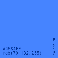 Цвет #4684FF в цветовой модели RGB обозначается тремя октетами (70, 132, 255) в десятичном формате и #4684FF в шестнадцатиричном (hex) формате, которые являются интенсивностью красного 70 (hex 46), интенсивность зелёного 132 (hex 84) и интенсивность синего 255 (hex FF).