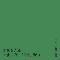 Цвет #468756 в цветовой модели RGB обозначается тремя октетами (70, 135, 86) в десятичном формате и #468756 в шестнадцатиричном (hex) формате, которые являются интенсивностью красного 70 (hex 46), интенсивность зелёного 135 (hex 87) и интенсивность синего 86 (hex 56).