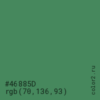 Цвет #46885D в цветовой модели RGB обозначается тремя октетами (70, 136, 93) в десятичном формате и #46885D в шестнадцатиричном (hex) формате, которые являются интенсивностью красного 70 (hex 46), интенсивность зелёного 136 (hex 88) и интенсивность синего 93 (hex 5D).