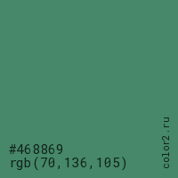 Цвет #468869 в цветовой модели RGB обозначается тремя октетами (70, 136, 105) в десятичном формате и #468869 в шестнадцатиричном (hex) формате, которые являются интенсивностью красного 70 (hex 46), интенсивность зелёного 136 (hex 88) и интенсивность синего 105 (hex 69).