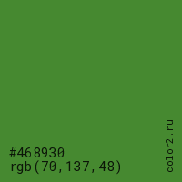 Цвет #468930 в цветовой модели RGB обозначается тремя октетами (70, 137, 48) в десятичном формате и #468930 в шестнадцатиричном (hex) формате, которые являются интенсивностью красного 70 (hex 46), интенсивность зелёного 137 (hex 89) и интенсивность синего 48 (hex 30).