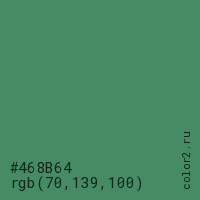 Цвет #468B64 в цветовой модели RGB обозначается тремя октетами (70, 139, 100) в десятичном формате и #468B64 в шестнадцатиричном (hex) формате, которые являются интенсивностью красного 70 (hex 46), интенсивность зелёного 139 (hex 8B) и интенсивность синего 100 (hex 64).
