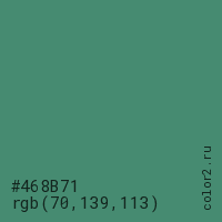 Цвет #468B71 в цветовой модели RGB обозначается тремя октетами (70, 139, 113) в десятичном формате и #468B71 в шестнадцатиричном (hex) формате, которые являются интенсивностью красного 70 (hex 46), интенсивность зелёного 139 (hex 8B) и интенсивность синего 113 (hex 71).