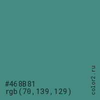 Цвет #468B81 в цветовой модели RGB обозначается тремя октетами (70, 139, 129) в десятичном формате и #468B81 в шестнадцатиричном (hex) формате, которые являются интенсивностью красного 70 (hex 46), интенсивность зелёного 139 (hex 8B) и интенсивность синего 129 (hex 81).