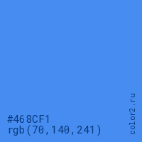 Цвет #468CF1 в цветовой модели RGB обозначается тремя октетами (70, 140, 241) в десятичном формате и #468CF1 в шестнадцатиричном (hex) формате, которые являются интенсивностью красного 70 (hex 46), интенсивность зелёного 140 (hex 8C) и интенсивность синего 241 (hex F1).
