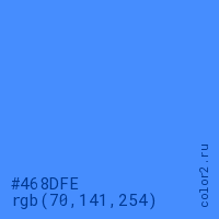 Цвет #468DFE в цветовой модели RGB обозначается тремя октетами (70, 141, 254) в десятичном формате и #468DFE в шестнадцатиричном (hex) формате, которые являются интенсивностью красного 70 (hex 46), интенсивность зелёного 141 (hex 8D) и интенсивность синего 254 (hex FE).