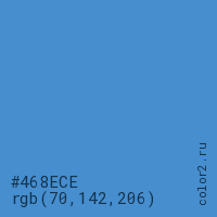 Цвет #468ECE в цветовой модели RGB обозначается тремя октетами (70, 142, 206) в десятичном формате и #468ECE в шестнадцатиричном (hex) формате, которые являются интенсивностью красного 70 (hex 46), интенсивность зелёного 142 (hex 8E) и интенсивность синего 206 (hex CE).