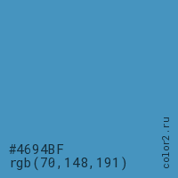 Цвет #4694BF в цветовой модели RGB обозначается тремя октетами (70, 148, 191) в десятичном формате и #4694BF в шестнадцатиричном (hex) формате, которые являются интенсивностью красного 70 (hex 46), интенсивность зелёного 148 (hex 94) и интенсивность синего 191 (hex BF).