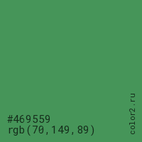 Цвет #469559 в цветовой модели RGB обозначается тремя октетами (70, 149, 89) в десятичном формате и #469559 в шестнадцатиричном (hex) формате, которые являются интенсивностью красного 70 (hex 46), интенсивность зелёного 149 (hex 95) и интенсивность синего 89 (hex 59).
