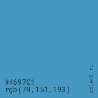 Цвет #4697C1 в цветовой модели RGB обозначается тремя октетами (70, 151, 193) в десятичном формате и #4697C1 в шестнадцатиричном (hex) формате, которые являются интенсивностью красного 70 (hex 46), интенсивность зелёного 151 (hex 97) и интенсивность синего 193 (hex C1).