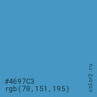 Цвет #4697C3 в цветовой модели RGB обозначается тремя октетами (70, 151, 195) в десятичном формате и #4697C3 в шестнадцатиричном (hex) формате, которые являются интенсивностью красного 70 (hex 46), интенсивность зелёного 151 (hex 97) и интенсивность синего 195 (hex C3).