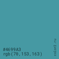 Цвет #4699A3 в цветовой модели RGB обозначается тремя октетами (70, 153, 163) в десятичном формате и #4699A3 в шестнадцатиричном (hex) формате, которые являются интенсивностью красного 70 (hex 46), интенсивность зелёного 153 (hex 99) и интенсивность синего 163 (hex A3).