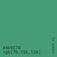 Цвет #469C78 в цветовой модели RGB обозначается тремя октетами (70, 156, 120) в десятичном формате и #469C78 в шестнадцатиричном (hex) формате, которые являются интенсивностью красного 70 (hex 46), интенсивность зелёного 156 (hex 9C) и интенсивность синего 120 (hex 78).